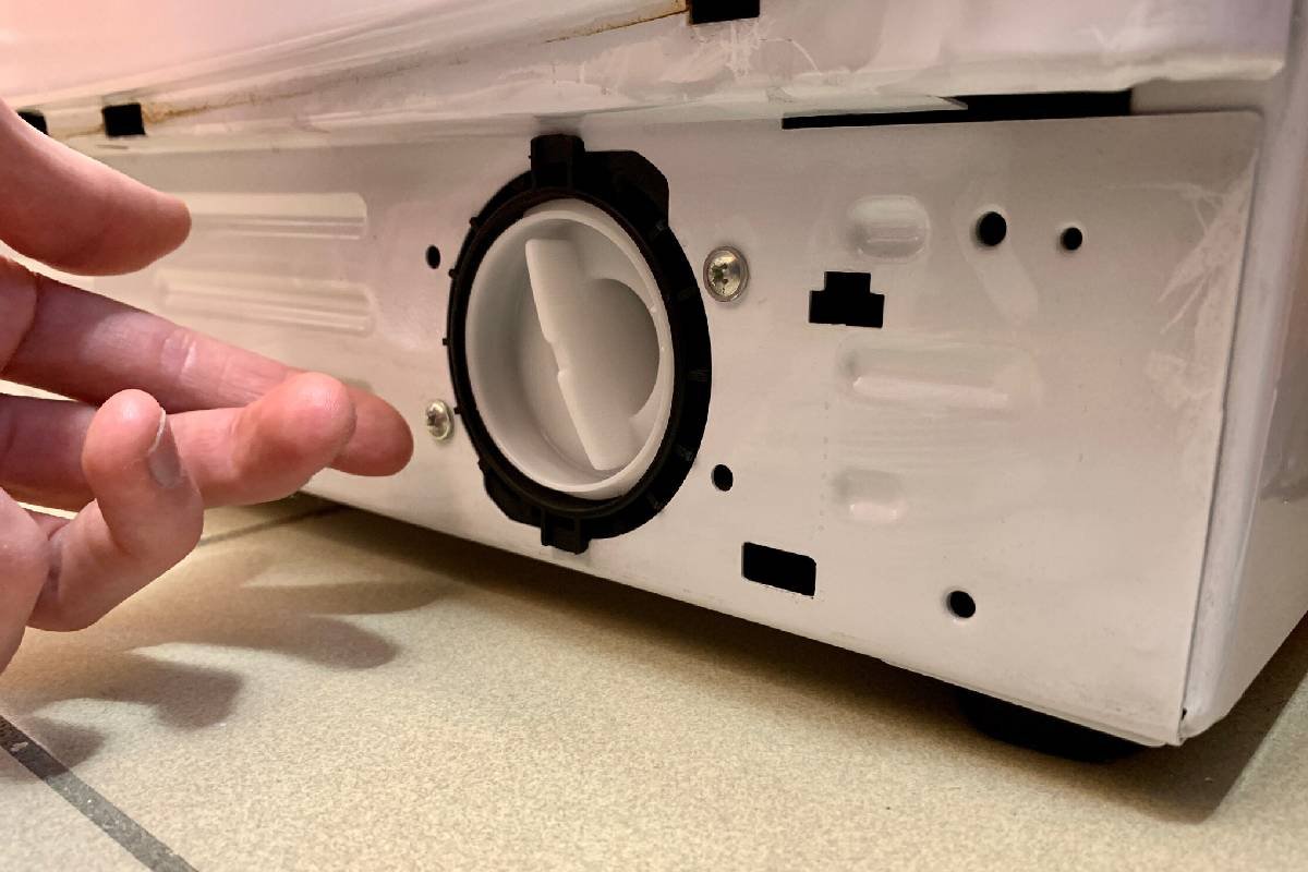 Il filtro è progettato appositamente per prevenire l’ingresso di oggetti estranei. Si trova sotto una piastra di plastica nella parte inferiore della lavatrice, chiuso ermeticamente da una tappo a vite e una guarnizione.